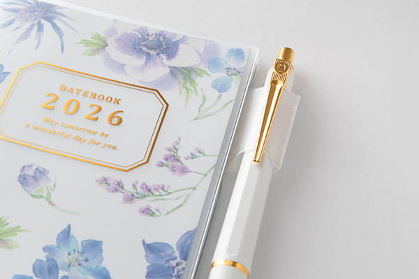 2026年版の表紙の花は「サムシングブルーのウエディングブーケ」をイメージして、アネモネ、デルフィニウム、ルリタマアザミなどをメインに青い花で構成しています。ダイアリーページも、ガーデニングでも人気の高い青い花たちをイメージしてまとめています。