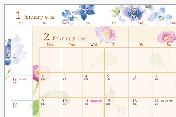 2026年版も月間スケジュールの始まり月が1月に、終わり月は翌年3月に変更になり、年度末までの予定が管理できるようになっています。