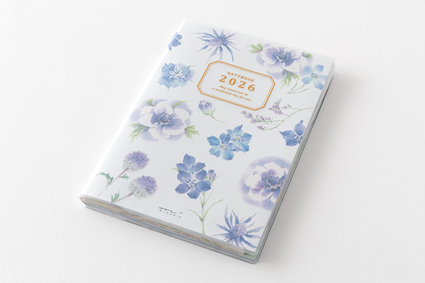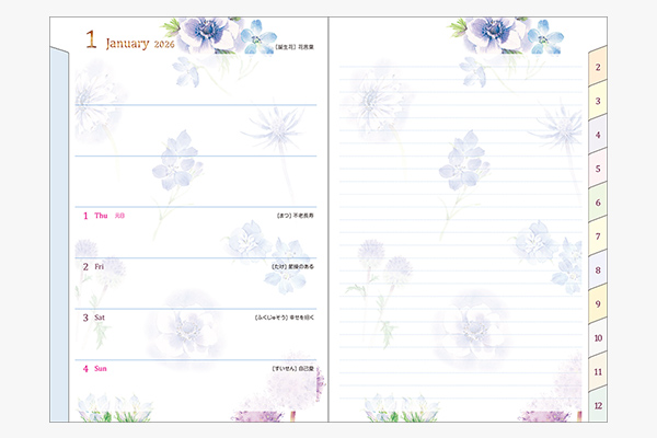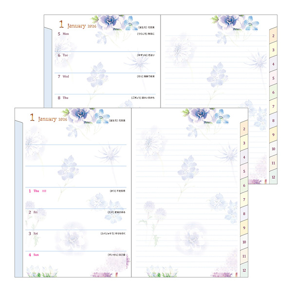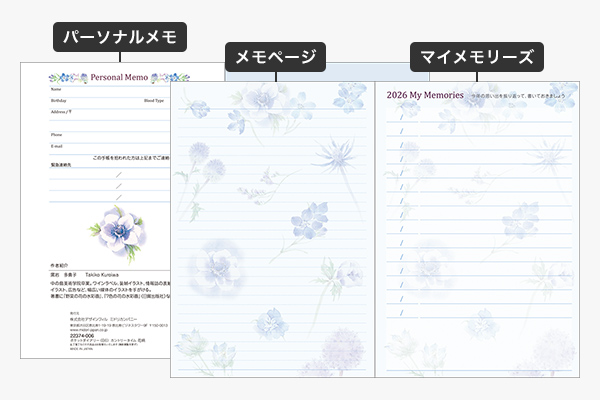 2026年版の表紙の花は「サムシングブルーのウエディングブーケ」をイメージして、アネモネ、デルフィニウム、ルリタマアザミなどをメインに青い花で構成しています。ダイアリーページも、ガーデニングでも人気の高い青い花たちをイメージしてまとめています。