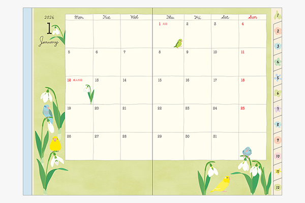2026年版も色とりどりのトリさんたちと植物を組み合わせたデザインで、毎日に彩りと癒しを届けます。