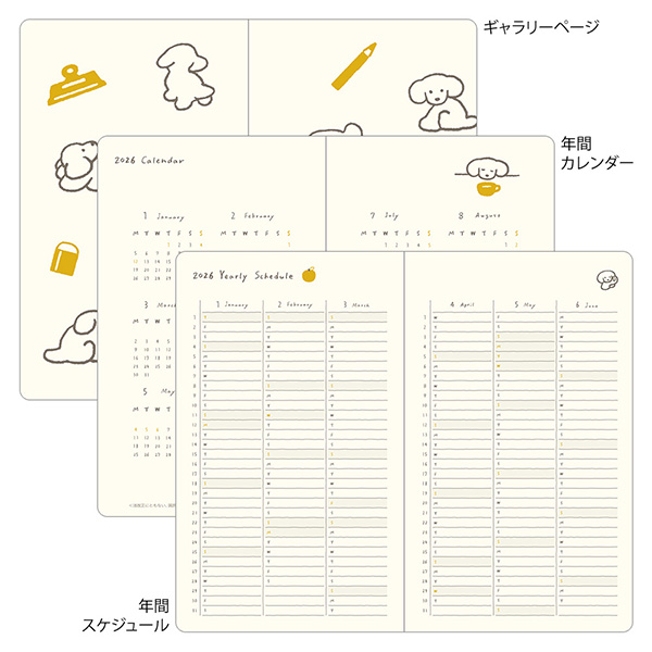 | 内容 | 年間カレンダー、年間スケジュール、 月間スケジュール(2026年1月~2026年12月※12ヵ月分)、 週間スケジュール(2026年1月~2026年12月※12ヵ月分)、 ギャラリーページ、フューチャーログ、 メモ(24ページ/ドット方眼罫)、 ウィッシュリスト、ハビットトラッカー、 ブックログ、スリープログ、マイコレクション、パーソナルメモ 【重要なお知らせ】 『2026年版 ブックスタイルダイアリー』<B6変型判>、イヌ柄 黄色/青緑 をお買い上げのお客さまへ>> ※2026年1月13日(火)以降のご注文につきましては、訂正シールを一緒にお送りいたします。 |
