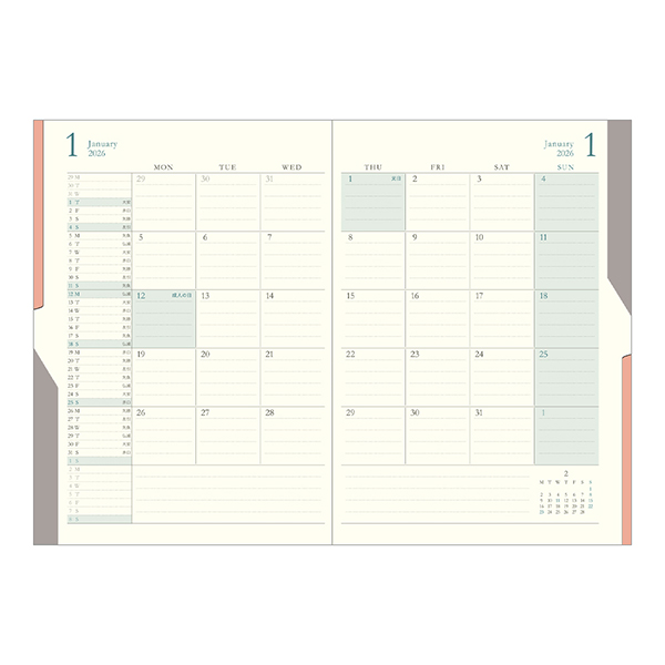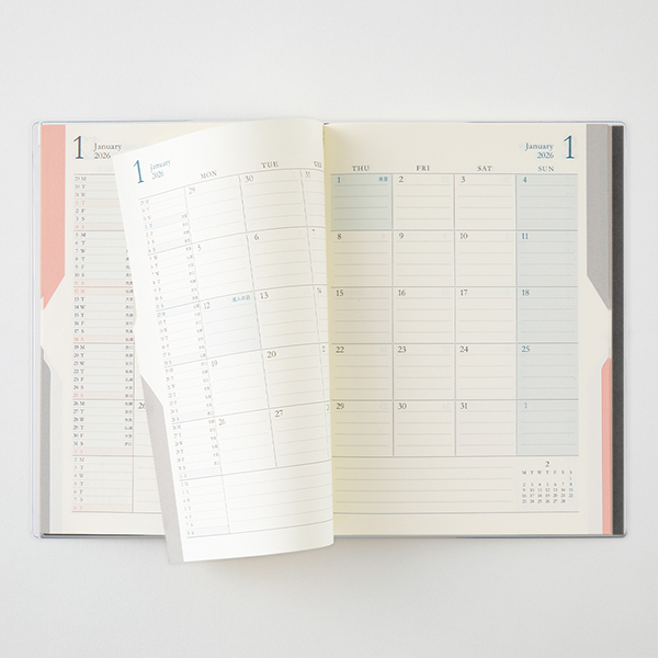 赤のインデックスの「1月」をめくると、次のページにはグレーのインデックス(青いページ)の「1月」が現れます。