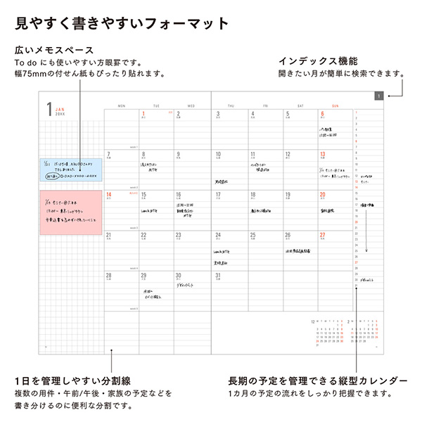 1日を管理しやすい罫線入りの月間ブロックフォーマット、To Doメモにも使いやすい広い方眼メモスペース、長期予定を管理できる縦型カレンダーなど、使いやすいポイントがたくさんのダイアリーリフィル(手帳の中身)。