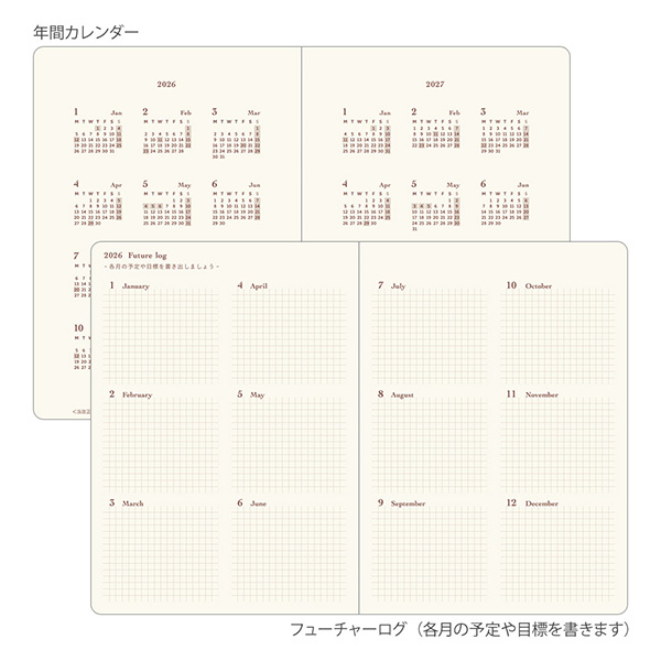 1年を俯瞰できる年間カレンダーと各月の予定や目標を書き出せる12ヵ月分のフューチャーログが付いています。