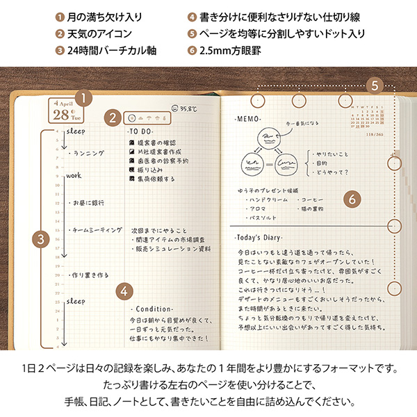 最大の特徴は見開き左右のページに内容を書き分けられること。ライフスタイルに合わせてさまざまな使い方を楽しんでください。