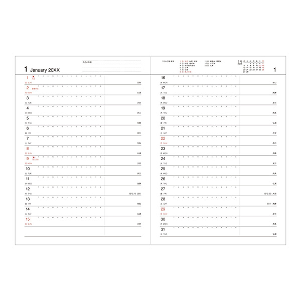 | 備考 | ●こちらの商品の異なるタイプ(4月始まり、9月始まり、日曜始まりなど)の発売予定はございません。 ●国民の祝日・休日などは、2025年2月3日発表の官報に基づいています。その後の、法改正にともない、変わる場合があります。 |
