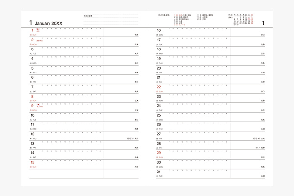 【月間ホリゾンタル】1月~12月までの月間ページは見開きで1ヵ月の予定をさっと一覧できます。(翌年1月~3月は1ページで1ヵ月)1日の予定を午前7時から午後8時まで時系列で記入できます。また、右端のメモスペースには、To Doを記入したりその日のメインタスクを記入するなど自由に使えます。