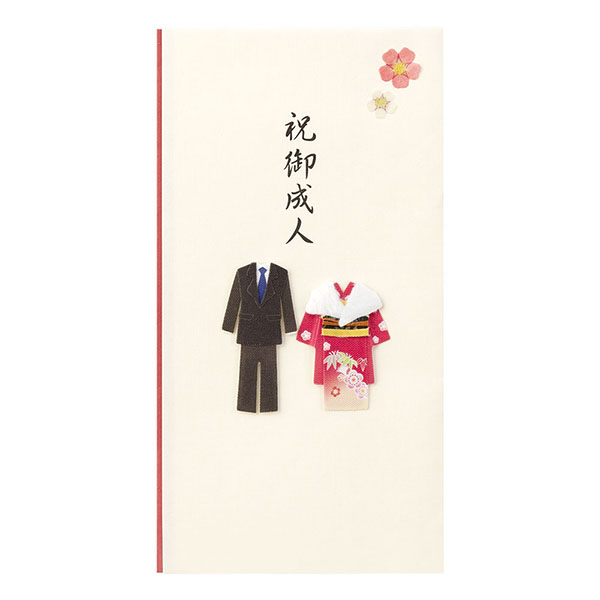 スーツと振袖がとても細かいところまで再現された、立体的なハンドメイドのクラフトシールが付いた祝儀袋です。
