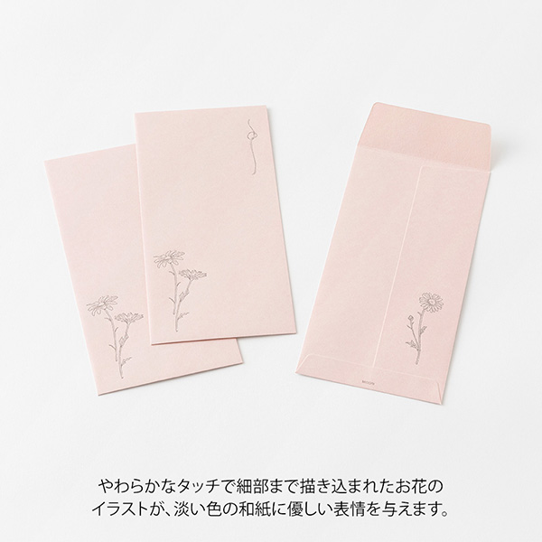 やわらかな色合いと肌合い、優しい透け感が特徴の「花色和紙」を使用したのし袋です。活版印刷で趣のある仕上がりとなっています。自社工場の職人が1枚1枚丁寧に印刷しており、繊細な花の絵柄が引き立ちます。