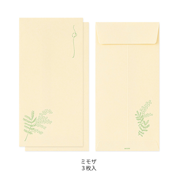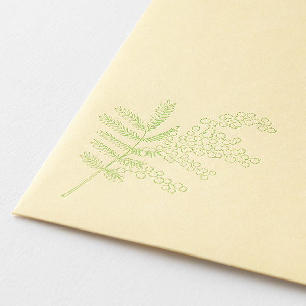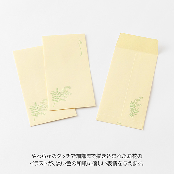 オリジナルで抄紙した先染めの越前和紙「花色和紙」を使用し、風に戯れて舞うような柔らかな「ミモザ」の黄色が和紙にうつされています。