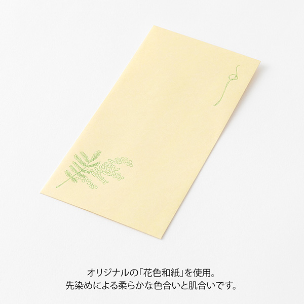 やわらかな色合いと肌合い、優しい透け感が特徴の「花色和紙」を使用したのし袋です。活版印刷で趣のある仕上がりとなっています。自社工場の職人が1枚1枚丁寧に印刷しており、繊細な花の絵柄が引き立ちます。