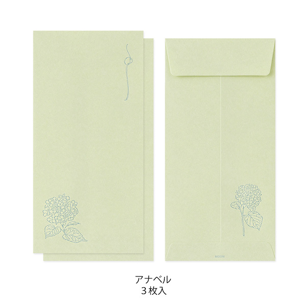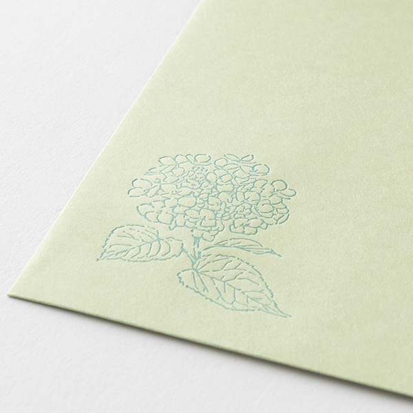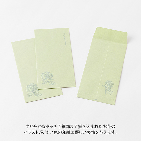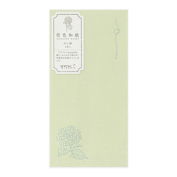 オリジナルで抄紙した先染めの越前和紙「花色和紙」を使用し、優しくふんわりと揺らめく「アナベル」の若葉色が和紙にうつされています。