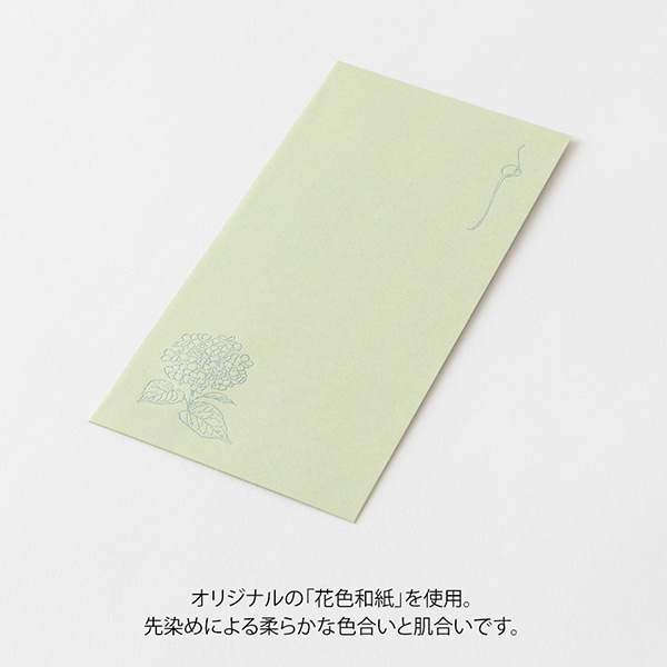 やわらかな色合いと肌合い、優しい透け感が特徴の「花色和紙」を使用したのし袋です。活版印刷で趣のある仕上がりとなっています。自社工場の職人が1枚1枚丁寧に印刷しており、繊細な花の絵柄が引き立ちます。
