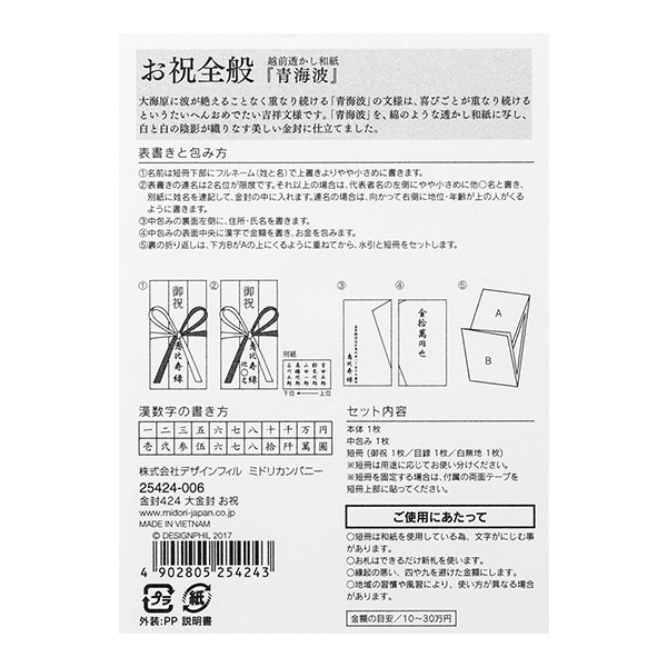 大海原に波が絶えることなく重なり続ける「青海波」の文様は、喜びごとが重なり続けるという大変おめでたい吉祥文様です。 「青海波」を錦のような透かし和紙に写し、白と白の陰影が織りなす美しい金封に仕立てました。