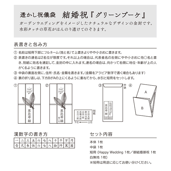 | 内容 | 1枚入(中袋付) 短冊〔Happy Wedding、御結婚御祝、無地:各1枚〕 表書きと包み方解説付 金額目安:2~5万円 |