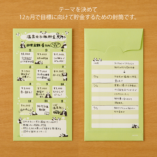 現金を封筒にいれて貯金をするための『貯金封筒』です。目的や目標金額を書き込むタイトル欄や、ルールや意気込みを書けるメモ欄がわかりやすく、かわいいデザインなので楽しみながら気軽に貯金できます◎封筒は2枚入りです。