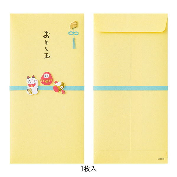 お正月にふさわしい、どなたにも使いやすいデザインのおとし玉袋。色鮮やかな封筒にお正月モチーフの繊細なペーパークラフトをあしらいました。