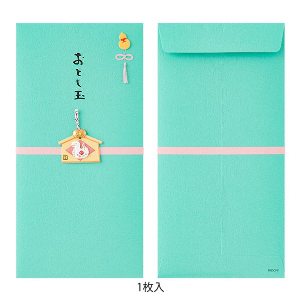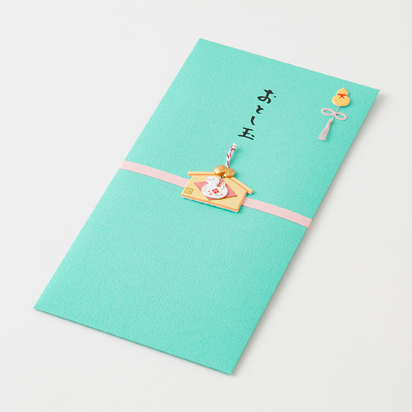 お正月にふさわしい、どなたにも使いやすいデザインのおとし玉袋。色鮮やかな封筒にお正月モチーフの繊細なペーパークラフトをあしらいました。