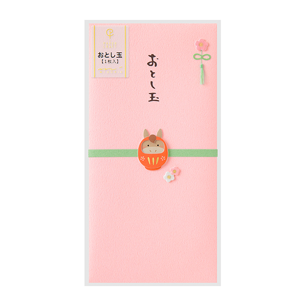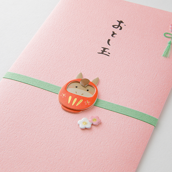 お正月にふさわしい、どなたにも使いやすいデザインのおとし玉袋。色鮮やかな封筒にお正月モチーフの繊細なペーパークラフトをあしらいました。