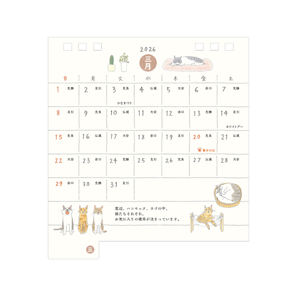 猫たちとともに季節の移り変わりを楽しめる卓上カレンダーです。インデックス付きで、小さいながらも実用的です。
