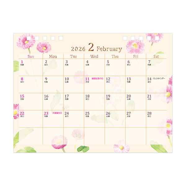 優しく可憐な印象の「カントリータイム 花柄」のカレンダー。手軽で使いやすい卓上タイプのカレンダーです。