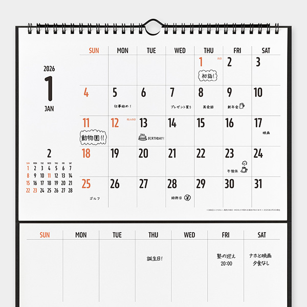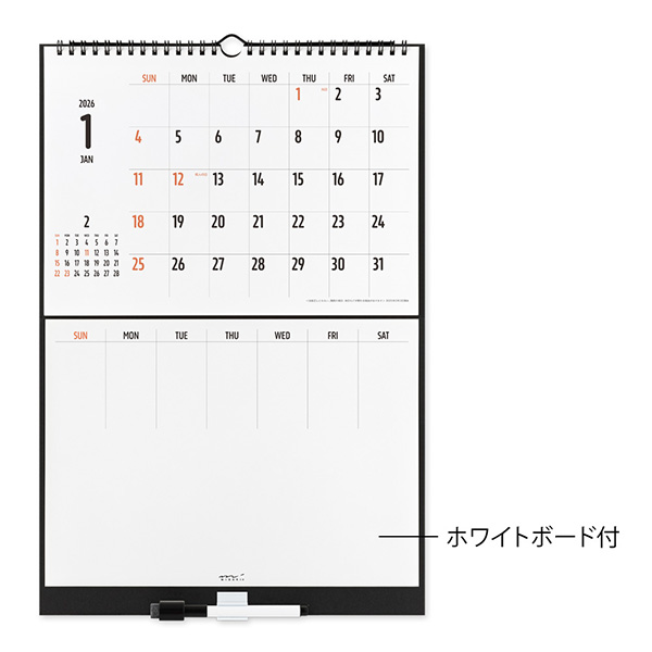 | 内容 | カレンダー12枚(2026年1月~12月) ホワイトボード1枚 ホワイトボードマーカー1本(黒:極細字) 次月表示有 ※マグネットはご使用になれません。 ※2025年版より「六曜」の表示はなくなりました。 |