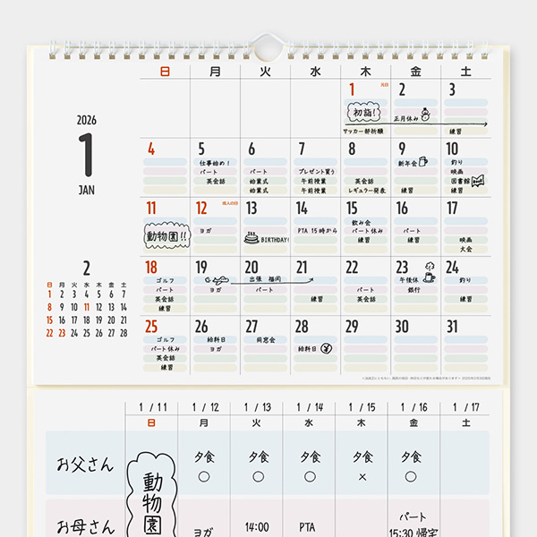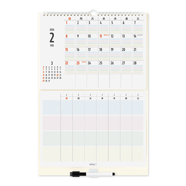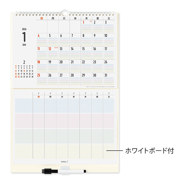 | 内容 | カレンダー12枚(2026年1月~12月) ホワイトボード1枚 ホワイトボードマーカー1本(黒:極細字) 次月表示有 ※マグネットはご使用になれません。 ※2025年版より「六曜」の表示はなくなりました。 |