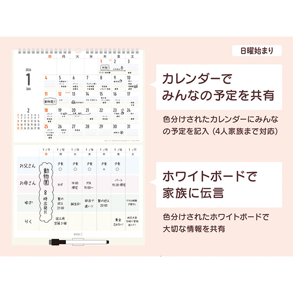 家族の予定管理や伝言・忘備録に便利な、書いて消せるホワイトボード付きのカレンダー。4色に色分けすることで、家族4人までの予定を一括で管理ができます。