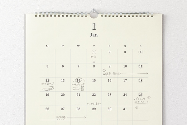 カレンダーの下部にはページの1/3ほどのたっぷりの余白を設けています。予定はもちろん、思いつきやひらめきを書き留めてください。