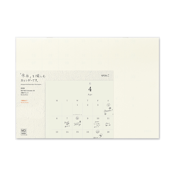 「MD用紙」厚口を使用した “余白”を愉しむカレンダー。12ヵ月のカレンダーページだけで構成したミニマルなデザインのカレンダーです。
