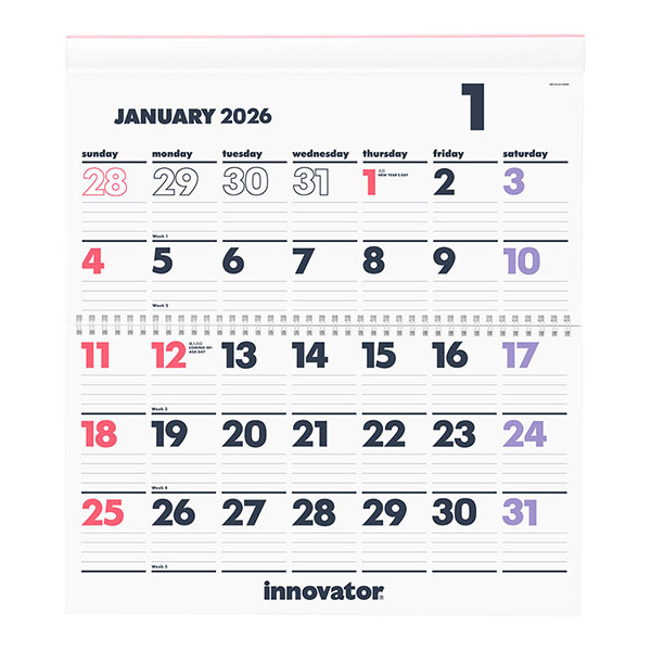 土曜は紫、日曜祝日は赤で色分けされており、曜日が分かりやすいシンプルかつ機能的なデザインが魅力のカレンダーです。
