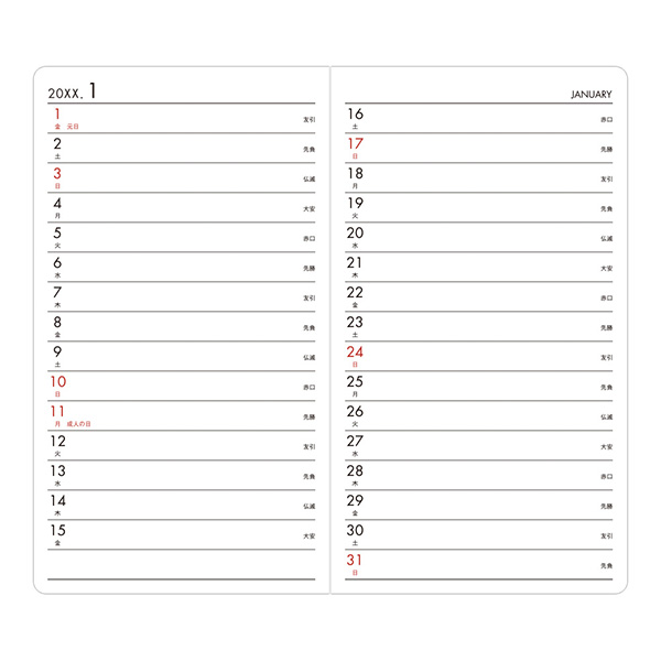 | 備考 | ●こちらの商品の異なるタイプ(4月始まり、9月始まり、日曜始まりなど)の発売予定はございません。 ●国民の祝日・休日などは、2023年2月1日発表の官報に基づいています。その後の、法改正にともない、変わる場合があります。 |