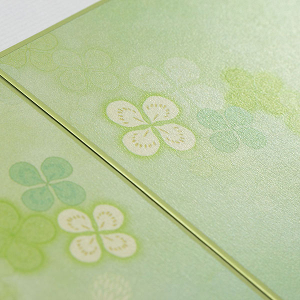 ラッキーモチーフとして知られる四つ葉のクローバーをデザインした色紙です。 かわいいリボンを結んでそのまま贈ることができる、人気の両開きタイプ。 開くと一般的な色紙の2倍のスペースで、たっぷり寄せ書きを書いたり、写真やプリクラを貼ったりと自由にお使いいただけます。