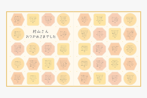 ガイドにあわせてメッセージシールを貼るだけで、簡単に寄せ書きが完成。配置のバランスが良く、統一感のあるカラーできれいな仕上がりになります◎