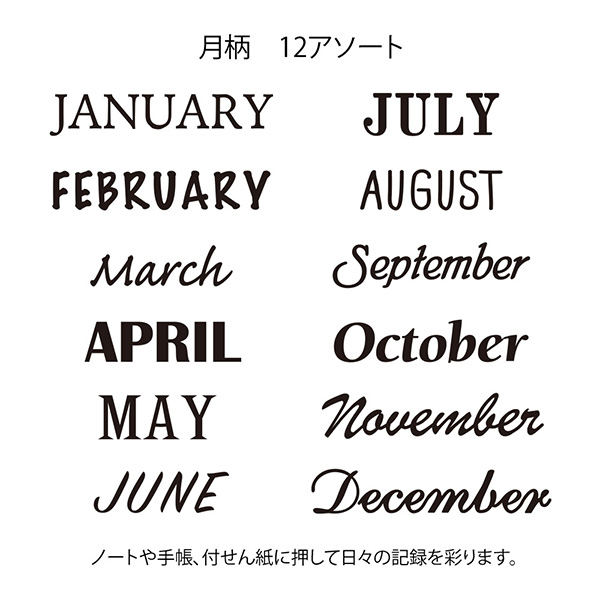 手帳やノートをかわいくデコレーション! バレットジャーナルにもおすすめな「12ヵ月柄」は、1つのスタンプで<JANUARY>から<December>までの12種類の柄を切り替えて使用できます。 自分では上手く描くのが難しい書体が簡単綺麗にスタンプで再現できます。