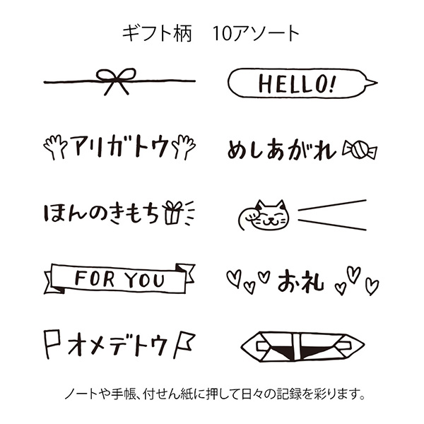 ダイアリーやノート、付箋、カードをかわいくデコレーション! 「ギフト柄」は1つのスタンプで、<アリガトウ>や<ほんのきもち>などのメッセージと、<リボンマーク>や<ネコ>のイラストなど、全部で10種類の柄を切り替えて使用できます。 誕生日や記念日の記録、ちょっとしたお礼のメッセージなどにぴったりです。