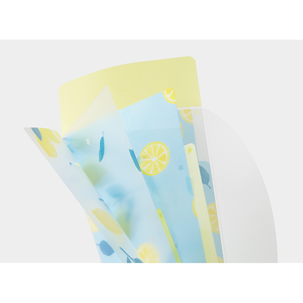 「レモン柄」は、爽やかなブルーの背景に手書き風のレモンが散りばめられた、かわいらしいデザインです。