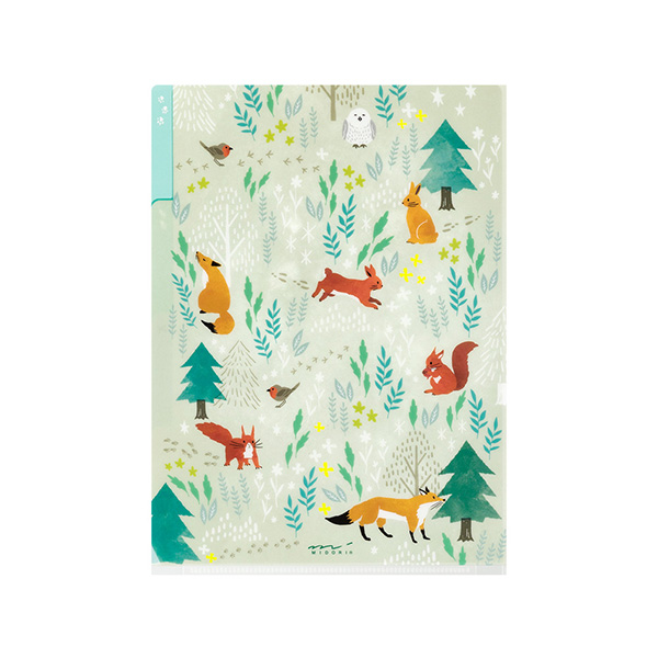 透明の素材を生かし、1枚目、2枚目、3枚目…とそれぞれのポケットに異なる絵柄をデザインしました。何も入れていないときと、書類を挟んだときとで絵柄が変わり見た目も楽しい!