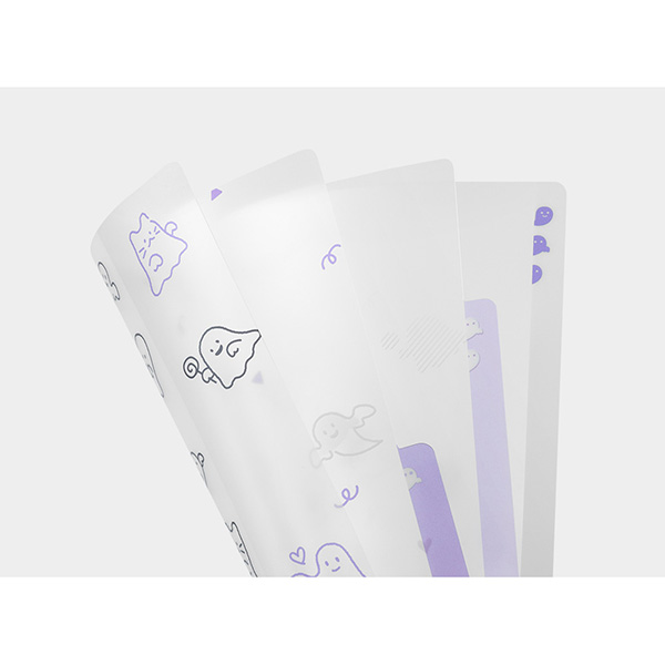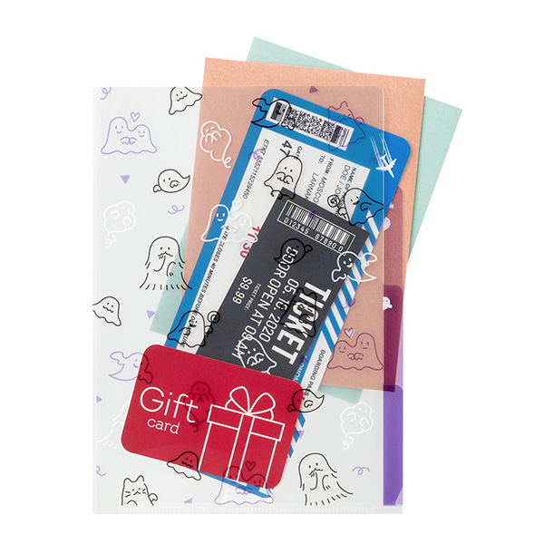 透明の素材を生かし、1枚目、2枚目、3枚目…とそれぞれのポケットに異なる絵柄をデザインしました。何も入れていないときと、書類を挟んだときとで絵柄が変わり見た目も楽しい!