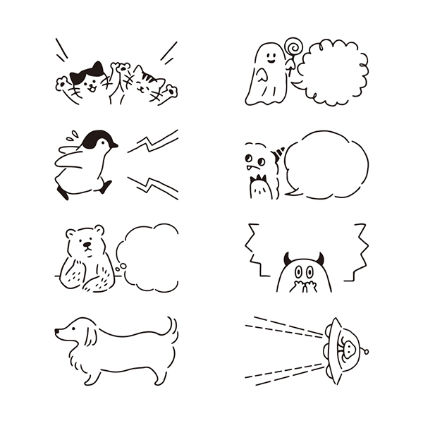 「ふきだし柄」は、使いやすい動物モチーフにくわえて、オバケや宇宙人なども組み合わせた、とてもユニークでかわいいデザインです。ちょっとしたメッセージやタイトルを書き足して、一気に楽しい雰囲気に♪
