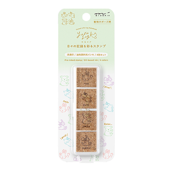 ノートのデコレーションを邪魔しない、優しい色合いの4色(ピンク、紫、青、緑)のスタンプが入ったセットです。軽い力でポンッと押すだけできれいに押せて、ゆるく楽しく日々の記録を彩ります。