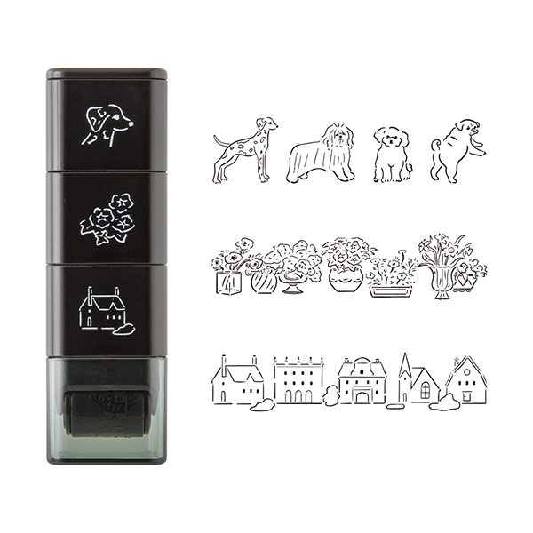 「イヌと風景柄」は、連続してポーズをとるイヌや花壇、家の3柄のモチーフです。イヌ柄を中心に、違うモチーフを組み合わせると用途の幅が広がります。花壇柄は連続して押してもかわいく、細かなデザインもポイントです◎