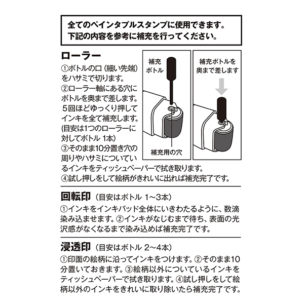 | 備考 | この補充インキはミドリの『ペインタブルスタンプ』に対応しています。他のスタンプには使用しないでください。 |