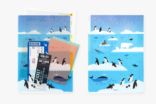 透明の素材を生かし、1枚目、2枚目、3枚目…とポケットごとに異なる絵柄がデザインされています。何も入れていないときと、書類を挟んだときとで絵柄が変わり見た目も楽しい!