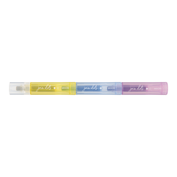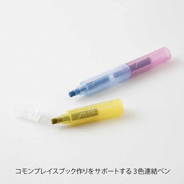 『ジョインドッツ』は、押すだけでドットがきれいに描ける、コモンプレイスブック作りをサポートする3色一体型の連結ペンです。コモンプレイスブック作りに不可欠なジャンルごとの色分けを、1本で手軽に行うことができます。