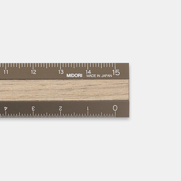 ブラウン色のアルミに濃色のウォールナットを合わせたシックな佇まい。定規の片側に1mm単位、反対側に0.5mm単位の目盛があります。