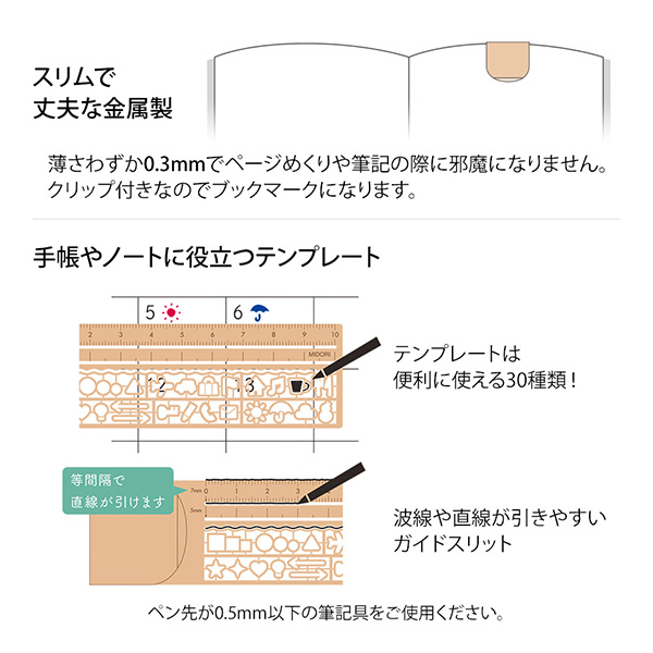 ブックマーカー、定規、テンプレートの3つの機能で手帳をサポートする「クリップルーラー」。0.3mmと非常に薄いためページをめくったり、筆記する際にも邪魔になりません。