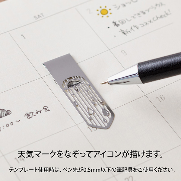 天候をモチーフにしたデザインの「天気柄」。テンプレートをなぞって「晴れ、雨、曇り、雪」のアイコンが描けます。機能性と意匠性を両立したブックマーカーです。