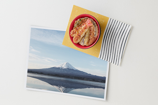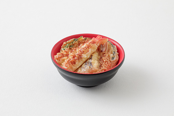 【天丼柄】古くから使われている内朱の丼ぶりで、揚げたての天ぷらにタレをかけて、できたてのように繊細に表現しました。