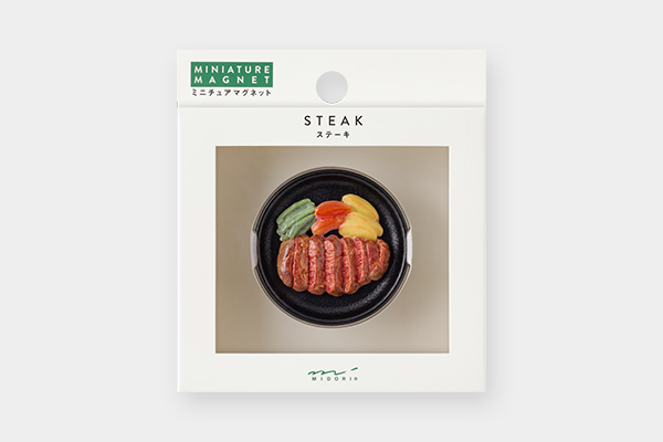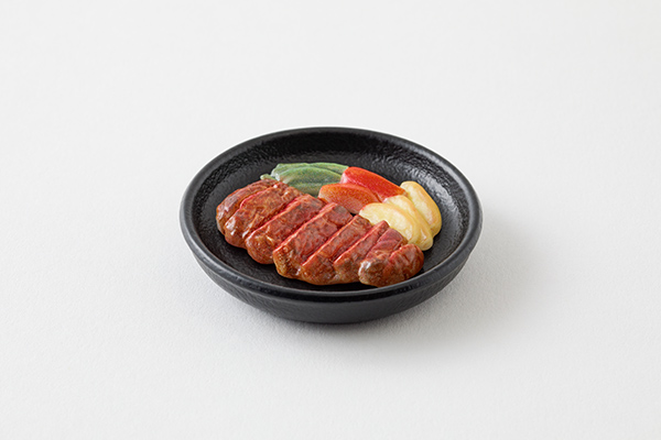 【ステーキ柄】黒の丸型鉄板に、焼き立てのステーキといんげん・人参・ジャガイモの付け合わせをのせ、繊細な作りで表現しています。
